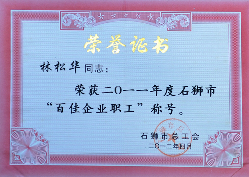 百佳企業(yè)職工榮譽(yù)證書